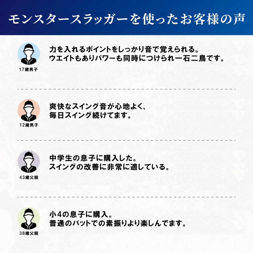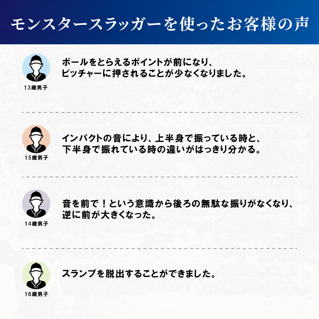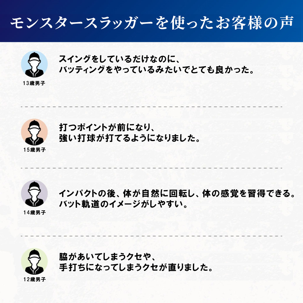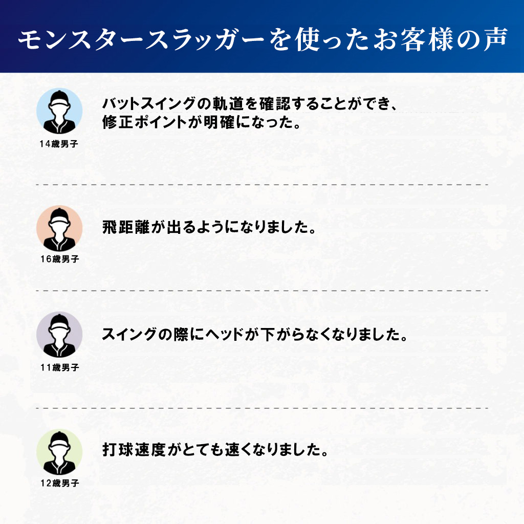 フォームの改善、ミート力アップ、ヘッドスピードアップ、軸の安定、飛距離アップ、打球速度アップ、筋力アップ