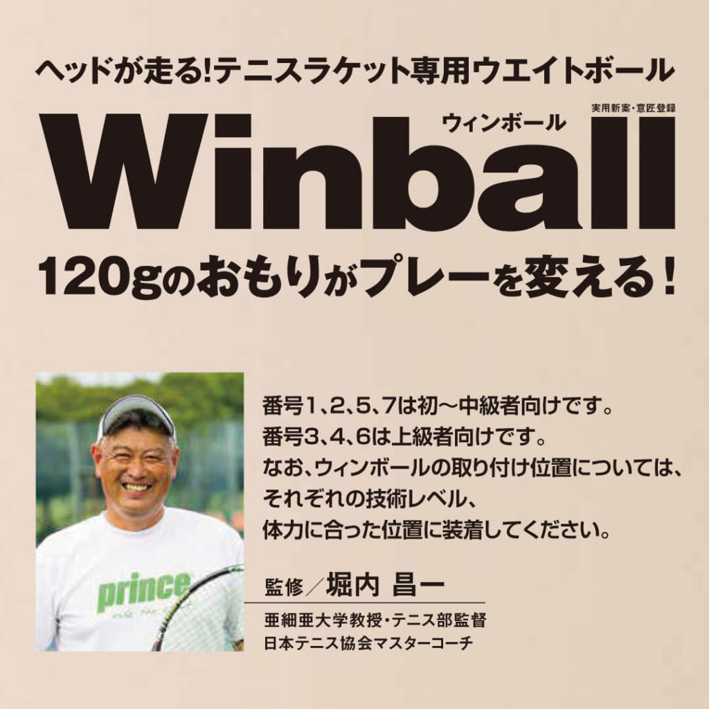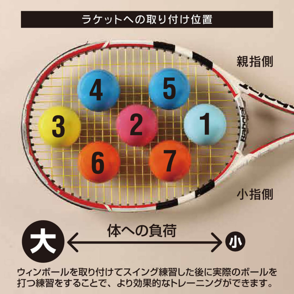 取り付ける位置によってスイングの負荷が変わり、サービス、トップスピン、アンダースピンの感覚を体感できます。また、ウィンボールを外した後に素振りをするとラケットヘッドが想像以上に走ります。