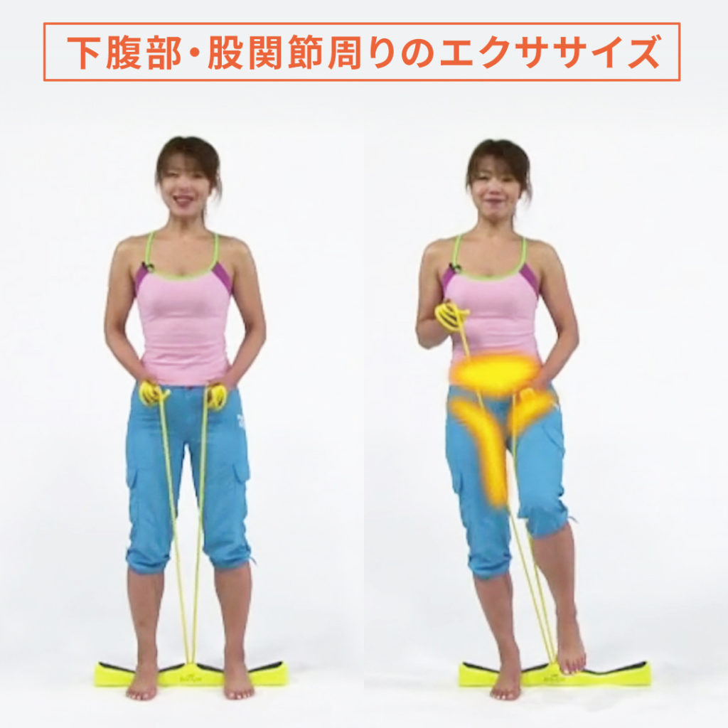 かかとを外側の傾斜に乗せて、チューブを1本ないし2本束ねて持ちます。片足を上げ、チューブを胸のあたりまで引っ張ります。