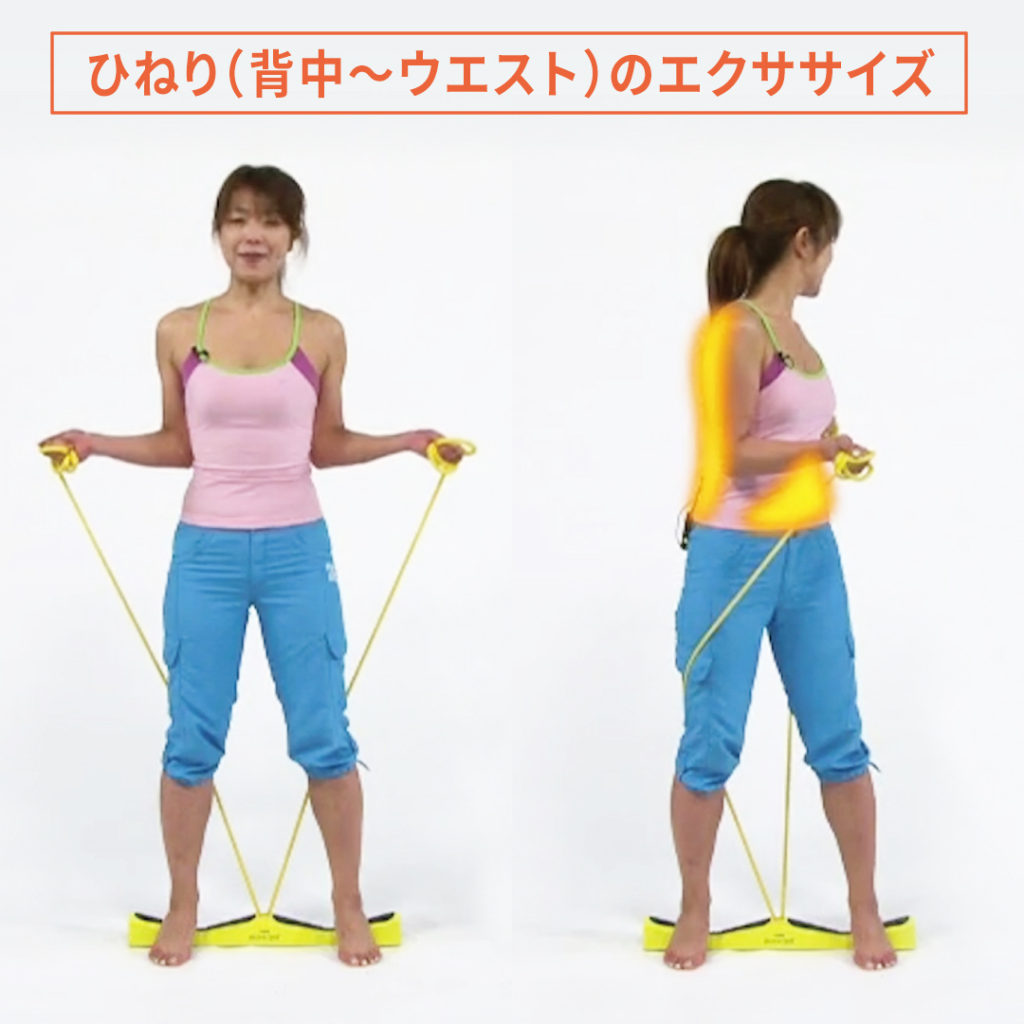かかとを外側の傾斜に乗せて、チューブを体の後ろにして両手で持ちます。上体をゆっくりひねります。この時お尻がついていかないようにしましょう。左右を行います。